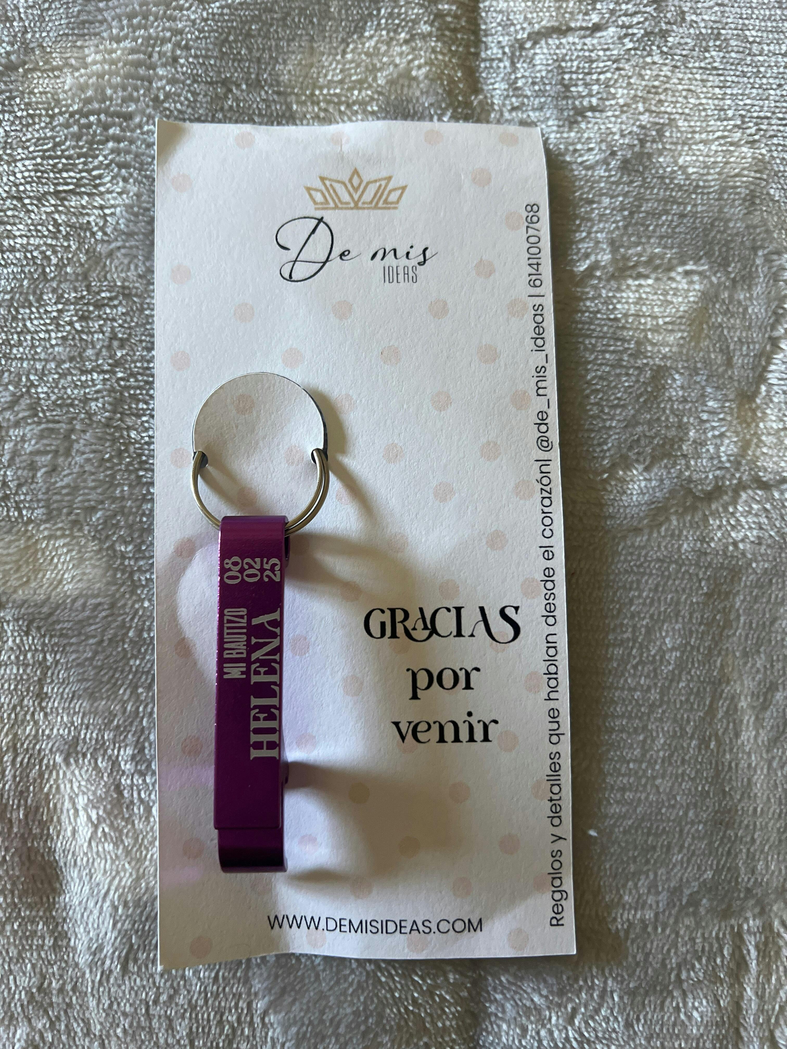 Llavero-abridor metálico personalizado, ideal como detalle para bautizos. Un regalo práctico y elegante para los invitados, personalizado con fecha y nombre. ¡Un recuerdo inolvidable de ese día tan especial!